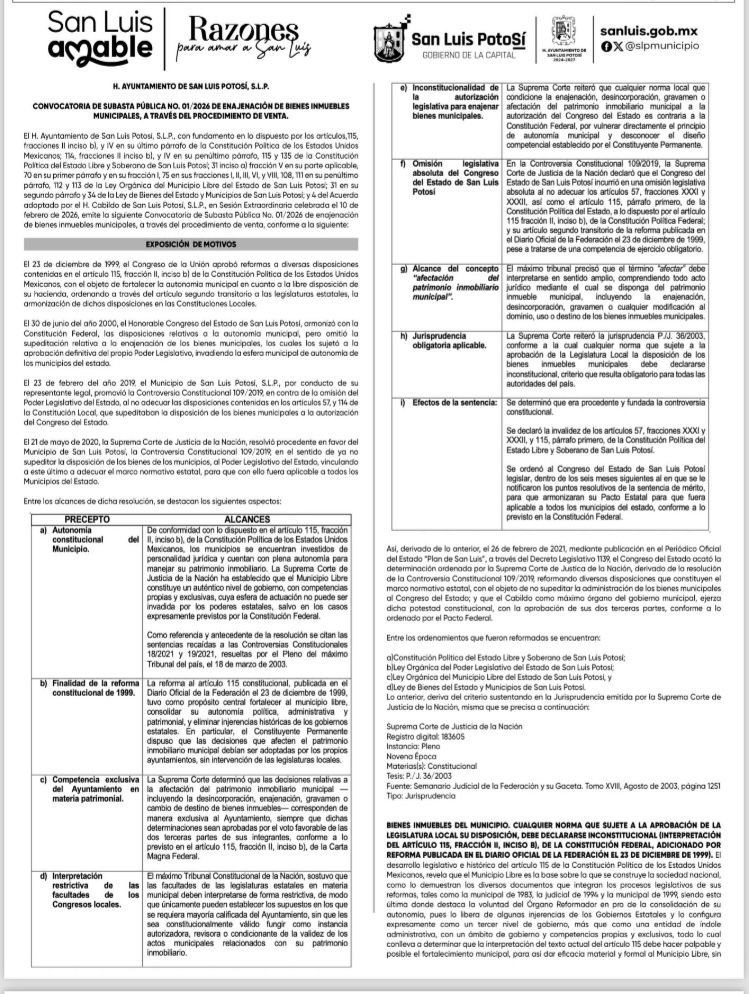 Luego de que el Cabildo de San Luis Potosí, mediante la aprobación unánime de los integrantes del Cabildo, enajenó 18 predios municipales para su venta con el fin de destinar los recursos a obras de alto impacto para la ciudad, el proceso de subasta y venta ya está en marcha, y la convocatoria con las bases para participar ya es difundida ampliamente, garantizando que todos los interesados puedan acceder a la información de manera transparente.