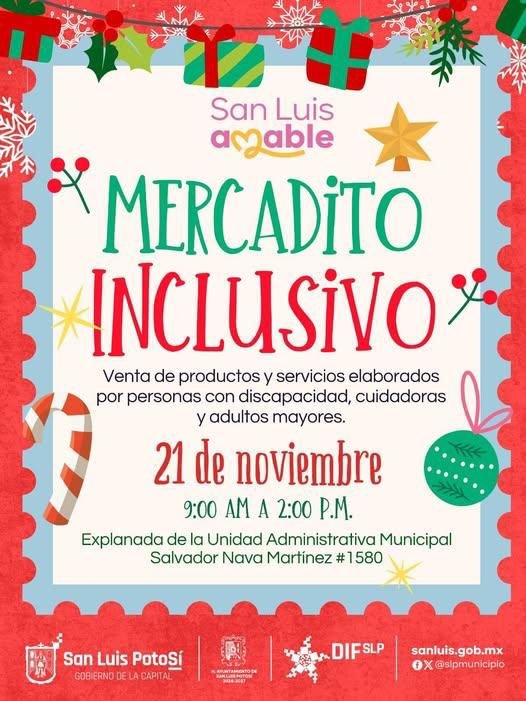 SLP.- El Sistema Municipal DIF de San Luis Potosí invita a todas y todos los potosinos a sumarse este 21 de noviembre al Mercadito Inclusivo, un espacio creado para impulsar el talento, el trabajo y el esfuerzo de personas con discapacidad, personas cuidadoras y adultos mayores que forman parte de nuestros programas de inclusión.