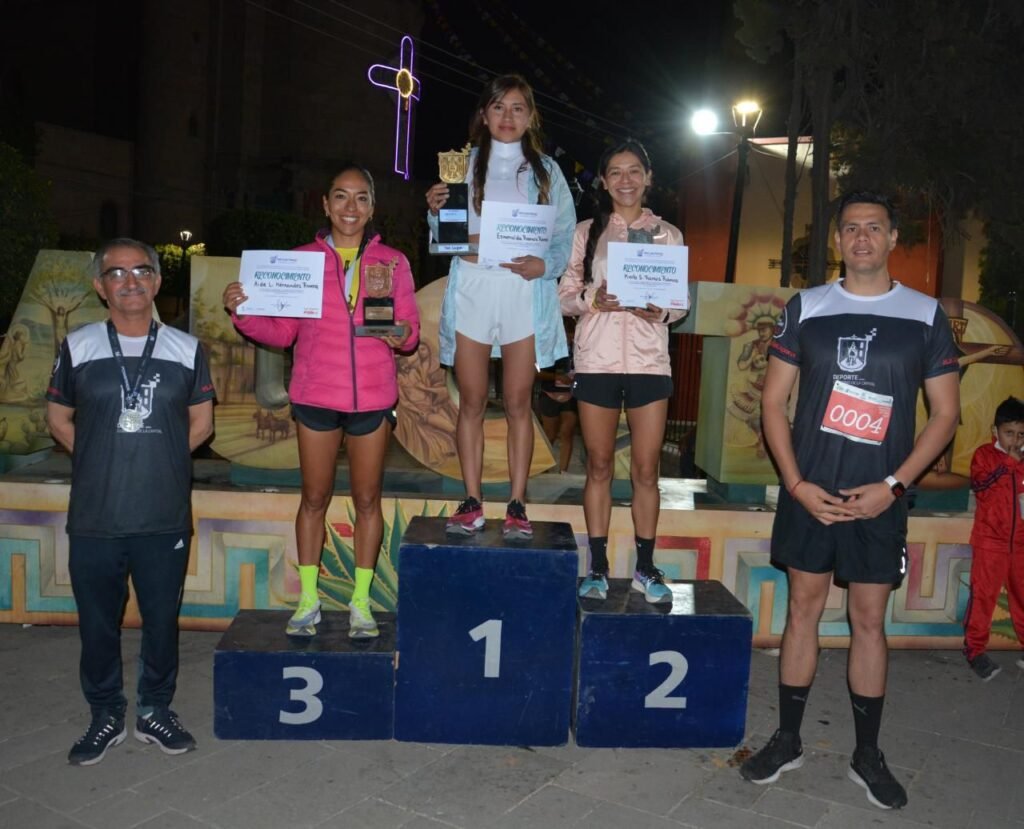 1.- Paula Nicolle Campos Martínez con 23 minutos y 15 segundos. 2.- Itzel Flores Martínez con 23 minutos y 34 segundos. 3.- Elvia Leticia Ramírez con 23 minutos y 36 segundos.