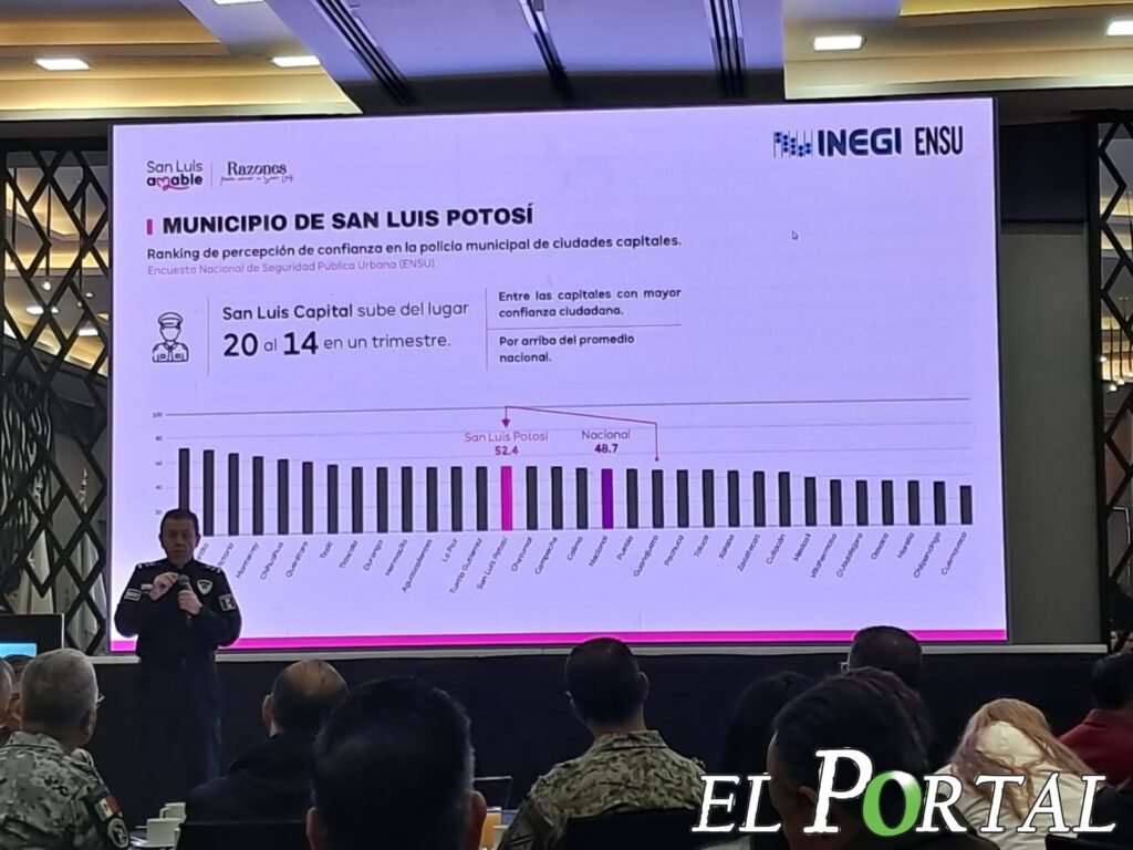 San Luis Potosí, S.L.P. (El Portal). – El Alcalde de San Luis Capital, Enrique Galindo Ceballos, lideró la presentación de resultados que colocan a San Luis Capital como una de las ciudades con mejores indicadores de seguridad en los últimos diez años, de acuerdo con datos oficiales del Instituto Nacional de Estadística y Geografía (INEGI) y del Secretariado Ejecutivo del Sistema Nacional de Seguridad Pública