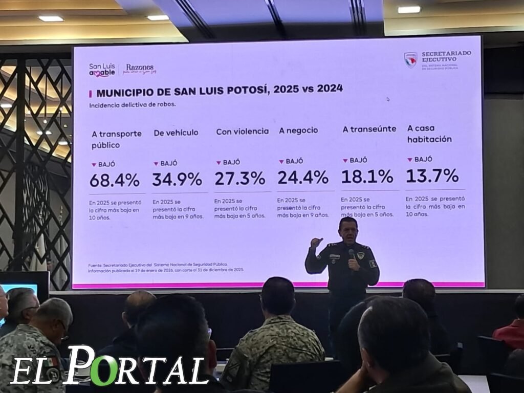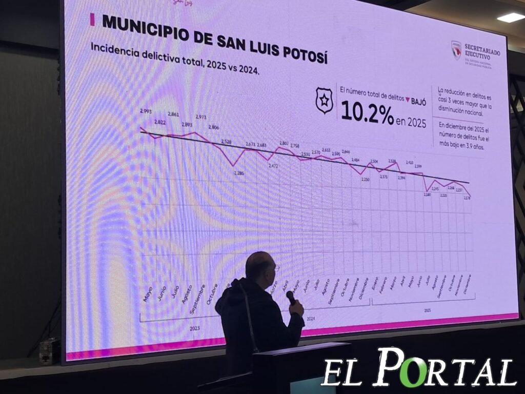 Durante la presentación “San Luis Capital, una ciudad segura y eficiente”, el secretario de Seguridad y Protección Ciudadana municipal, Juan Antonio de Jesús Villa Gutiérrez, informó que en 2025 se logró una reducción del 54 % en homicidios dolosos, cifra que representa la más baja en los últimos nueve años y una disminución 2.5 veces mayor que la media nacional. En el delito de secuestro, la reducción fue del 75 %, el nivel más bajo en una década.