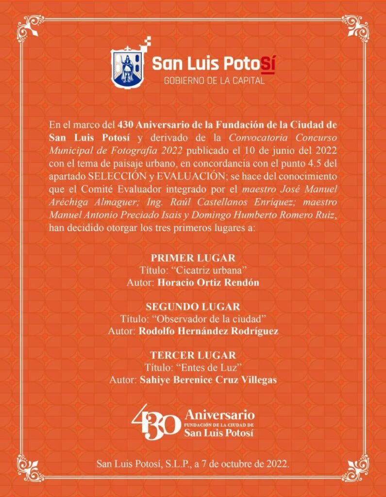 En el marco del 430 Aniversario de la Ciudad de San Luis Potosí y derivado de la Convocatoria Concurso Municipal de Fotografía 2022 publicado el 10 de junio del 2022 con el tema de paisaje urbano, y en concordancia con el punto 4.5 del apartado Selección y evaluación; se hace del conocimiento que el Comité Evaluador integrado por el maestro José Manuel Aréchiga Almaguer; Ing. Raúl Castellanos Enríquez; maestro Manuel Antonio Preciado Isais y Domingo Humberto Romero Ruiz, han decidido otorgar los tres primeros lugares a: