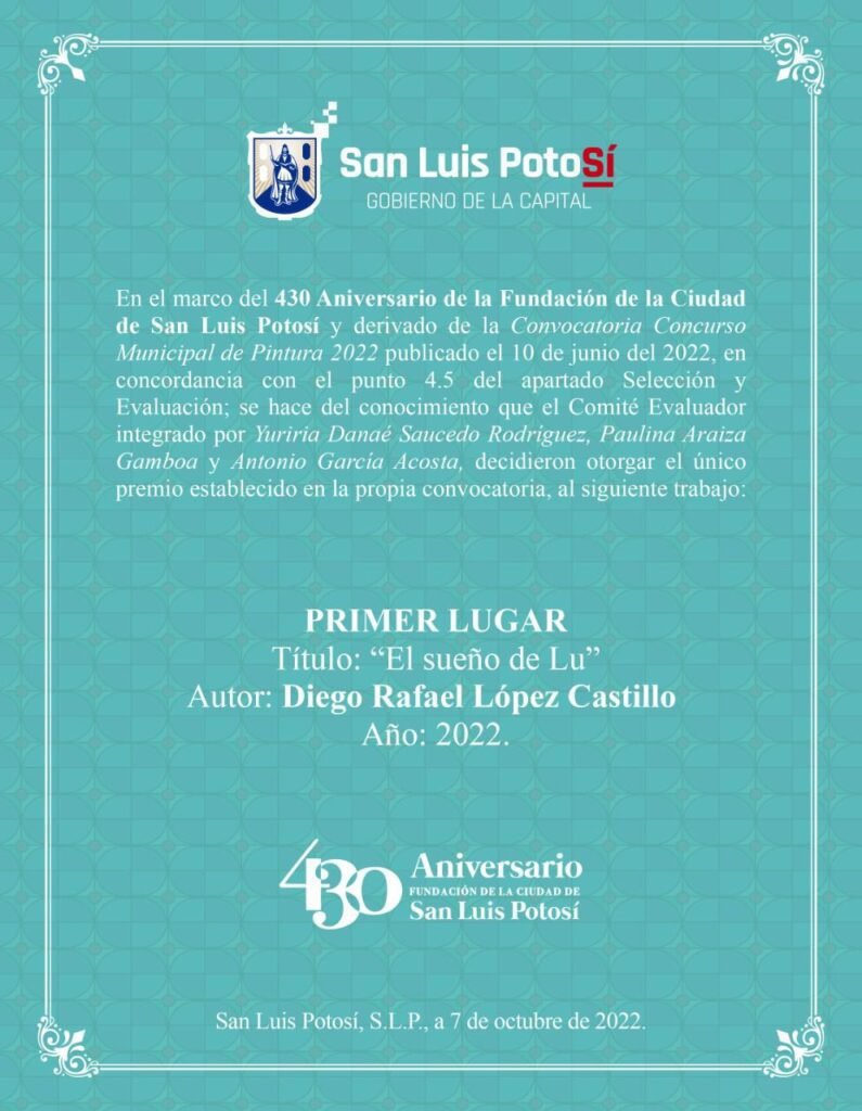 En el marco del 430 Aniversario de la Ciudad de San Luis Potosí y derivado de la Convocatoria Concurso Municipal de Pintura 2022 publicado el 10 de junio del 2022, en concordancia con el punto 4.5 del apartado Selección y Evaluación; se hace del conocimiento que el Comité Evaluador integrado por Yuriria Danaé Saucedo Rodríguez, Paulina Araiza Gamboa y Antonio García Acosta, decidieron otorgar el único premio establecido en la propia convocatoria, al siguiente trabajo: