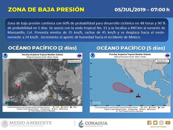 Una zona de baja presión en el Océano Pacífico tiene 60% de probabilidad de desarrollo ciclónico en el pronóstico a 48 horas, se localizó aproximadamente a 840 kilómetros (km) al suroeste de Manzanillo, Colima, con vientos de 35 km/h, rachas de 45 km/h y desplazamiento al oeste-noroeste a 24 km/h. Sus bandas nubosas favorecen el ingreso de humedad hacia el occidente de México.