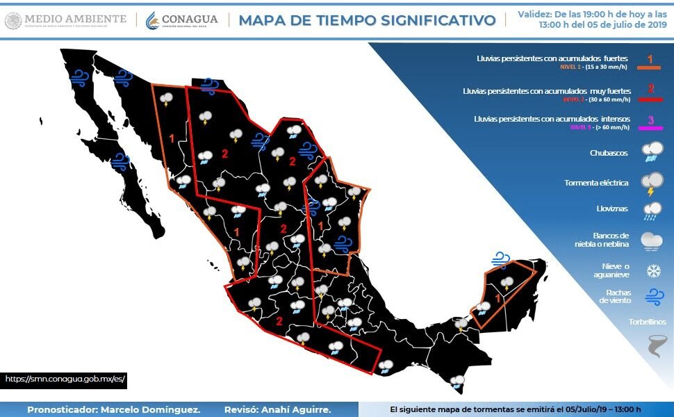 El pronóstico meteorológico para hoy es de lluvias puntuales muy fuertes en Chihuahua, Durango, Jalisco, Colima, Michoacán, Guerrero, Oaxaca y Chiapas.