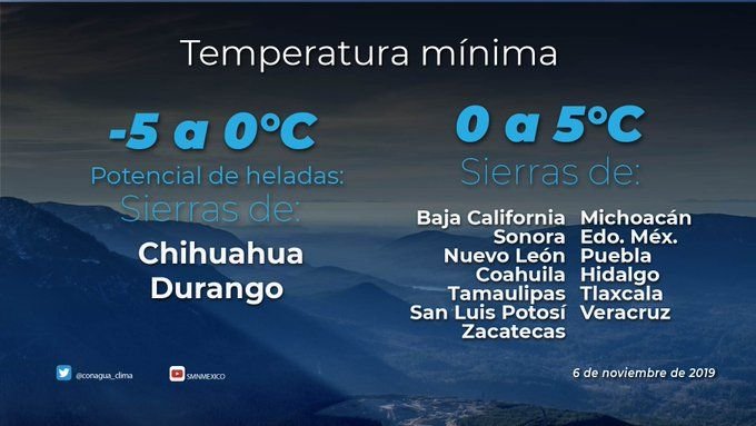 Se estiman temperaturas mínimas de -5 a 0 grados Celsius con posibles heladas en las sierras de Chihuahua y Durango, y de 0 a 5 grados Celsius en las montañas de Baja California, Sonora, Nuevo León, Coahuila, Tamaulipas, San Luis Potosí, Zacatecas, Michoacán, Estado de México, Puebla, Hidalgo, Tlaxcala y Veracruz.