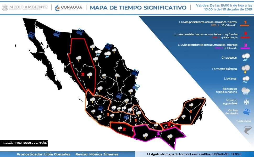 Las condiciones meteorológicas descritas serán generadas por dos canales de baja presión atmosférica extendidos en diferentes regiones de México, la entrada de humedad procedente del Océano Pacífico y la Onda Tropical Número 14, localizada en el sur de las costas de Michoacán y Guerrero.