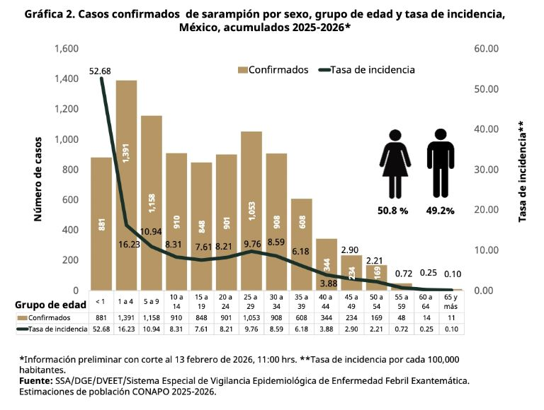 De acuerdo con la Secretaría de Salud federal, del 1 de enero de 2025 al 13 de febrero de 2026 se han confirmado 9,478 casos de sarampión en México