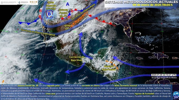 El Frente Frío Número 30 y la Sexta Tormenta Invernal generará chubascos, marcado descenso de temperatura y heladas o nevadas se desplazarán sobre el norte y el noreste de México y provocarán ambiente gélido y vientos con rachas superiores a 90 km/h en Chihuahua, Durango, Zacatecas y Coahuila; de 80 km/h en Nuevo León y Tamaulipas, así como rachas de 60 km/h en zonas de la Península de Baja California, Sonora, Aguascalientes, Guanajuato, San Luis Potosí y Campeche.