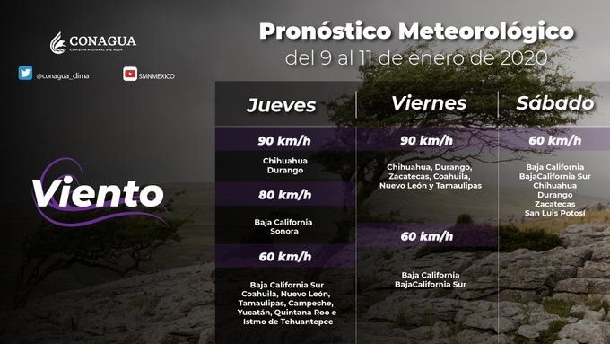 Asimismo, se pronostican rachas de viento de 90 kilómetros por hora (km/h) en Chihuahua y Durango; de 80 km/h en zonas de Baja California y Sonora y de 60 km/h en Baja California Sur, Coahuila, Nuevo León y Tamaulipas.
