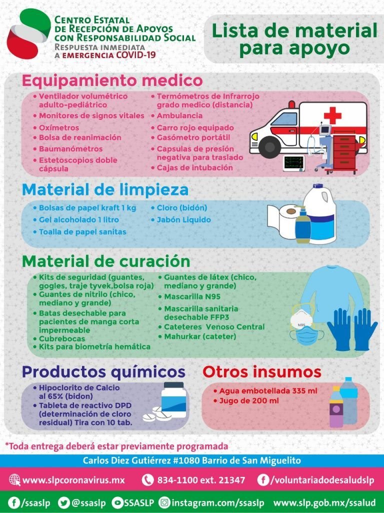 Algunos de los materiales de limpieza que pueden ser donados son: bolsas de papel kraft; Gel alcoholado; Toallas de papel sanitas; cloro y jabón líquido. Material de curación: kits de seguridad (guantes, gogles, traje tyvek, bolsa roja); guantes de nitrilo; batas desechables de manga corta impermeable; cubrebocas; kits para biometría hemática; guantes de latex, mascarillas N95; mascarillas sanitarias desechables FFP3; catéteres venoso central y Mahurkar (catéter).