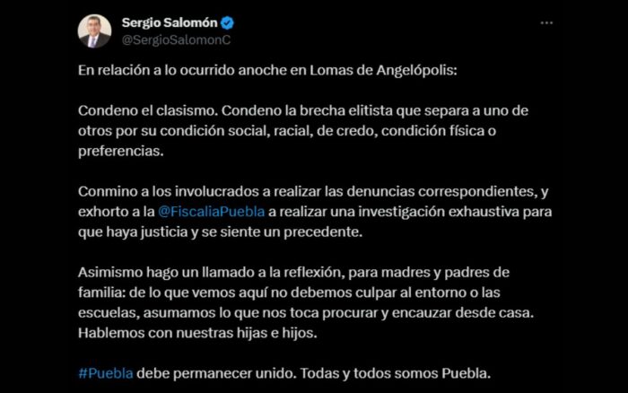 A su vez, el senador Alejandro Armenta, precandidato morenista al gobierno poblano, se unió a la condena del gobernador. Destacó la conexión entre el clasismo y el racismo, señalando que estas brechas propician un ambiente de violencia que daña a la sociedad. Armenta expresó su acuerdo con Salomón y llamó a la unidad, enfatizando que quienes aman a Puebla desean ver la erradicación de este tipo de comportamientos.