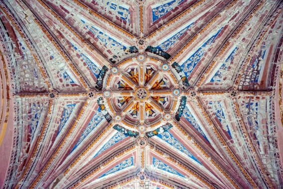 la excursión termina en San Miguel Achiutla, con su convento de arquitectura compleja, decoración que parece plateresca y un distintivo especial: paredes y bóvedas de color azul añil con figuras abstractas, un gran spot para admirar en silencio y fotografiar.