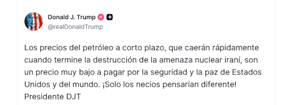 El aumento a corto plazo de los precios del petróleo, que caerán rápidamente cuando termine la destrucción de la amenaza nuclear de Irán, es un precio muy pequeño a pagar por la seguridad y la paz de Estados Unidos y del mundo. ¡Solo los tontos pensarían lo contrario!”, escribió el mandatario a través de su plataforma Truth Social.