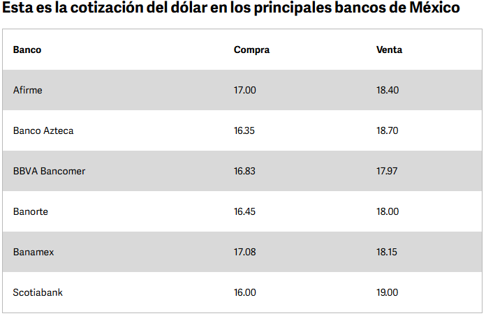 En las instituciones bancarias de México y la frontera norte, el dólar a la venta se cotiza en los $17.93, mientras que a la compra se localiza en los $16.80, en promedio.