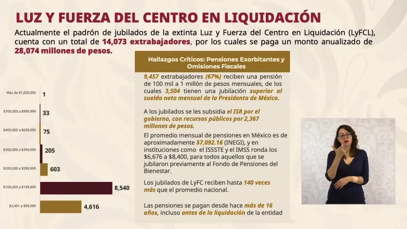 Durante la conferencia matutina de este miércoles, la secretaria Anticorrupción y Buen Gobierno, Raquel Buenrostro, detalló que en el caso de la extinta Luz y Fuerza del Centro —cerrada en 2009— existen más de 14 mil extrabajadores jubilados, lo que representa un costo anual de 28 mil millones de pesos. De ese total, casi 70% recibe pensiones que van de 100 mil pesos hasta más de un millón de pesos mensuales. Además, estas jubilaciones cuentan con subsidios al ISR que significan un gasto adicional de 2 mil 400 millones de pesos al año.