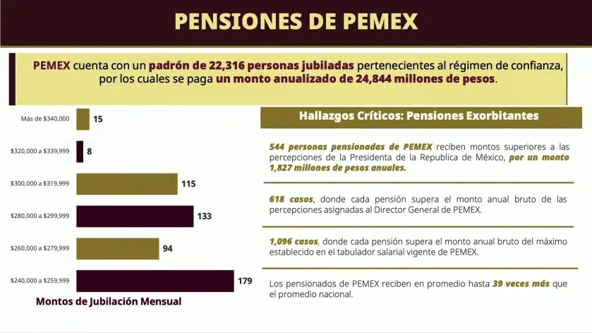 - Petróleos Mexicanos (Pemex) cuenta con más de 22 mil jubilados, con un costo anual cercano a 25 mil millones de pesos. Al menos 618 exfuncionarios reciben pensiones superiores a las percepciones de la presidenta, y en promedio sus jubilaciones son 39 veces mayores que el ingreso medio nacional.