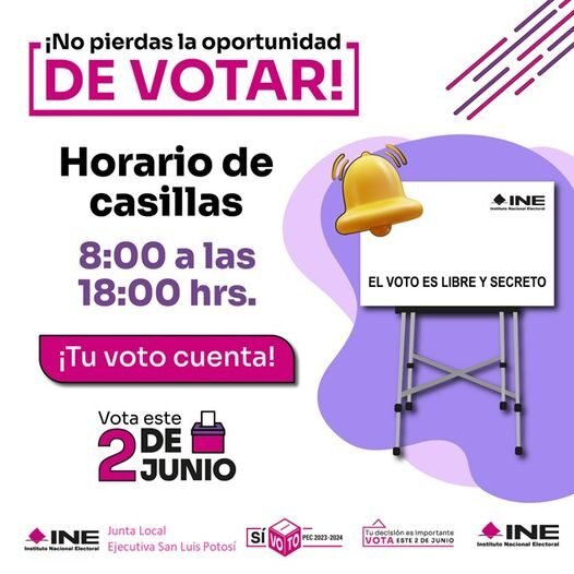 El horario de las casillas estarán abiertas de las 08:00 A.M y darán cierre a las 18:00 hrs