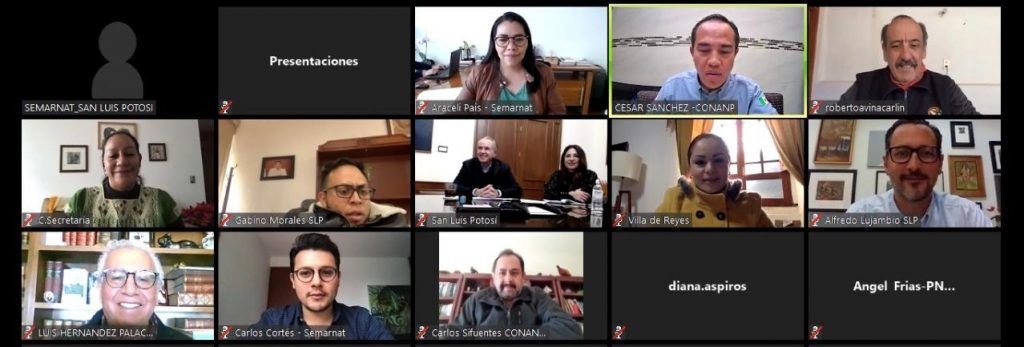 La titular de la Semarnat, María Luisa Albores González, y el gobernador Juan Manuel Carreras López, encabezaron una reunión virtual en la que estuvieron presentes sus respectivos equipos de trabajo, además de los titulares de la Procuraduría Agraria, Luis Hernández Palacios Mirón y de la Comisión Nacional de Áreas Naturales Protegidas (Conanp), Roberto Aviña Carlín; así como los alcaldes de San Luis Potosí, Alfredo Lujambio Cataño; de Villa de Reyes, Erika Irasema Briones Pérez, y de Mexquitic de Carmona, Rafael Pérez Rojas.