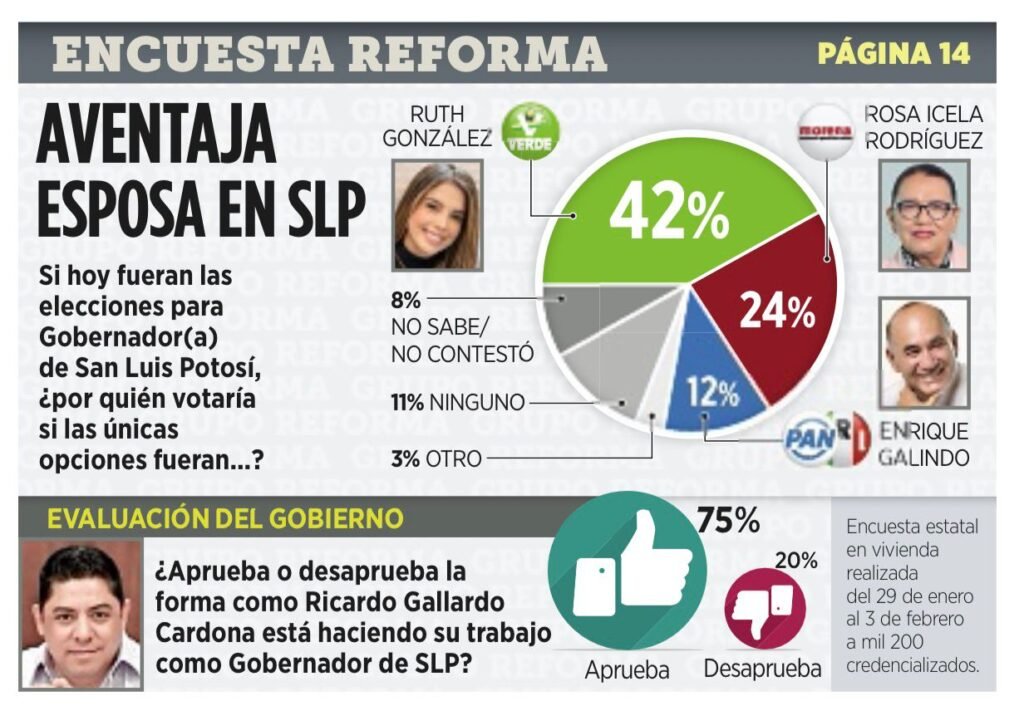 Lo anterior se confirma con los datos de la más reciente encuesta en vivienda aplicada a mil 200 personas en el estado, donde el 75 por ciento de las y los potosinos aprueba la forma en que el Gobernador está realizando su trabajo, se trata de una cifra contundente que refleja confianza ciudadana y respaldo social al proyecto de gobierno emanado del Partido Verde.