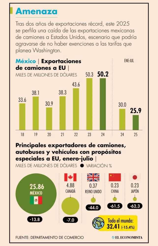 El presidente Donald Trump informó este jueves que impondrá un arancel de 25% a las importaciones estadounidenses de camiones a partir del 1 de octubre de 2025, una medida que tendrá un gran impacto para México, si no lo excluye.