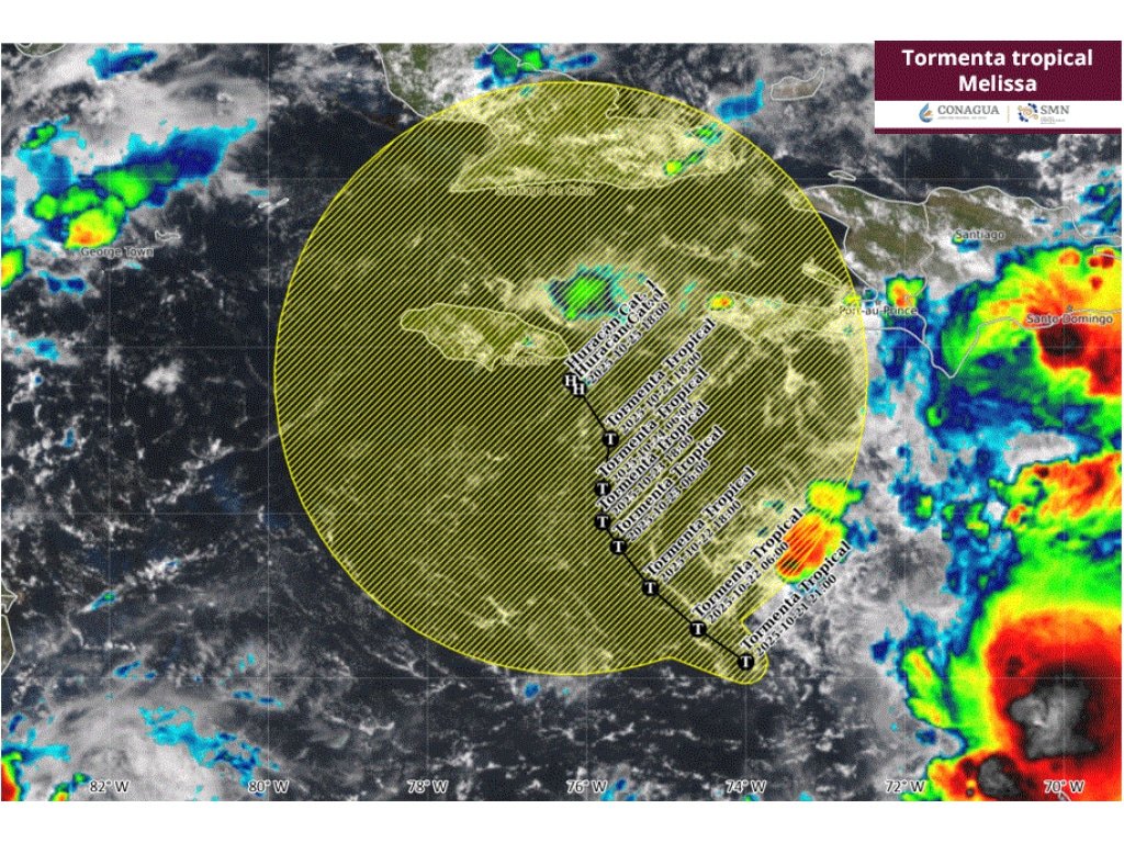 “Melissa” se consolida con vientos máximos sostenidos de 85 km/h y avanza hacia el Oeste. Las autoridades han emitido vigilancia de huracán para el sur de Haití ante la amenaza de efectos de huracán y de tormenta conforme el ciclón se fortalezca y provoque lluvias torrenciales y graves inundaciones a finales de semana.