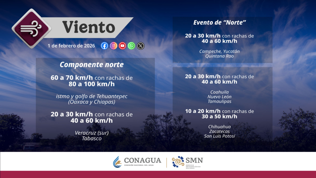 Viento de componente norte de 60 a 70 km/h con rachas de 80 a 100 km/h: istmo y golfo de Tehuantepec (Oaxaca y Chiapas); y de 20 a 30 km/h con rachas de 40 a 60 km/h: Veracruz (sur) y Tabasco.