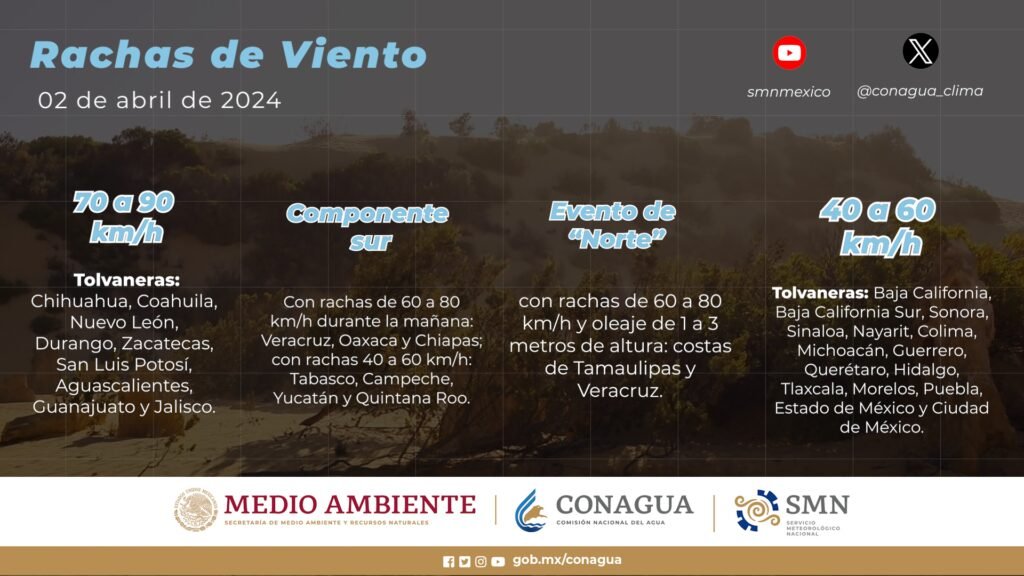 Vientos con rachas de 70 a 90 km/h y tolvaneras: Chihuahua, Coahuila, Nuevo León, Durango, Zacatecas, San Luis Potosí, Aguascalientes, Guanajuato y Jalisco.