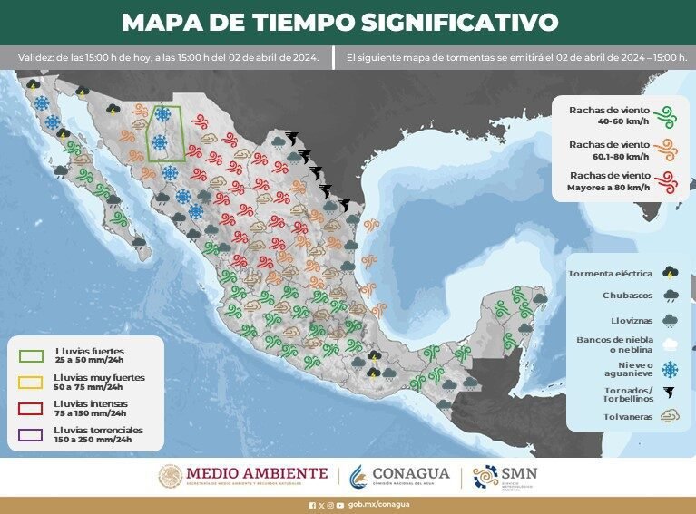 Vientos con rachas de 40 a 60 km/h y tolvaneras: Baja California, Baja California Sur, Sonora, Sinaloa, Nayarit, Colima, Michoacán, Guerrero, Querétaro, Hidalgo, Tlaxcala, Morelos, Puebla, Estado de México y Ciudad de México.