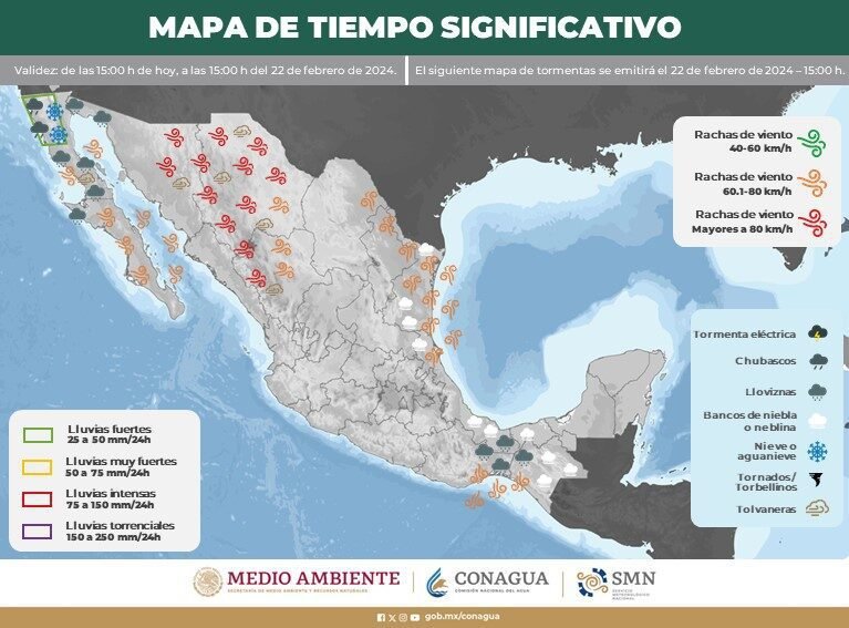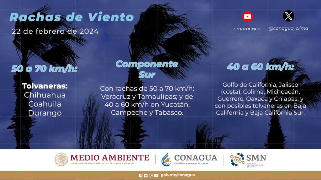 Vientos con rachas de 40 a 60 km/h: Golfo de California, Jalisco (costa), Colima, Michoacán. Guerrero, Oaxaca y Chiapas; y con posibles tolvaneras en Baja California y Baja California Sur.