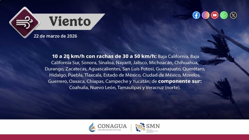 Viento de 10 a 20 km/h con rachas de 30 a 50 km/h: Baja California, Baja California Sur, Sonora, Sinaloa, Nayarit, Jalisco, Michoacán, Chihuahua, Durango, Zacatecas, Aguascalientes, San Luis Potosí, Guanajuato, Querétaro, Hidalgo, Puebla, Tlaxcala, Estado de México, Ciudad de México, Morelos, Guerrero, Oaxaca, Chiapas, Campeche y Yucatán; de componente sur: Coahuila, Nuevo León, Tamaulipas y Veracruz (norte).