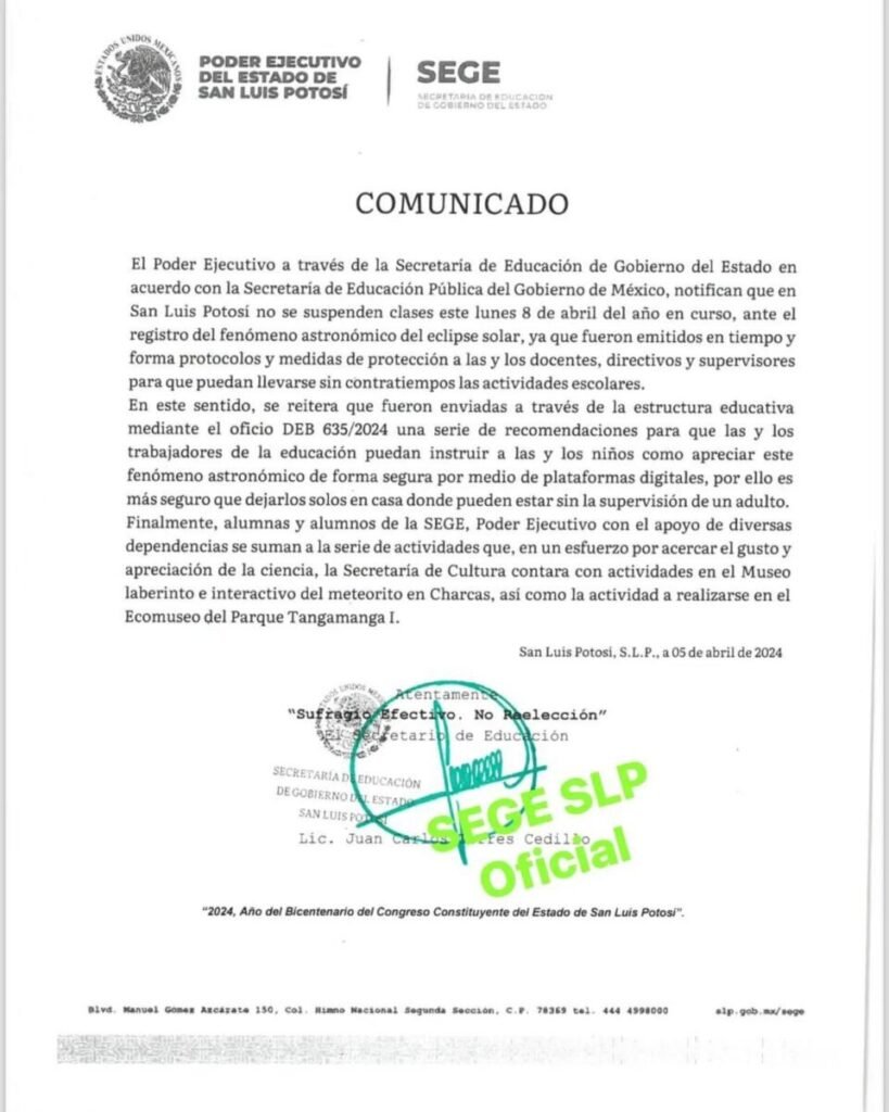 La Secretaria de Educación de Gobierno del Estado de San Luis Potosí, ha notificado que en el Estado de San Luis Potosí no se suspenderán las clases el día 08 de abril del 2024 , por el Eclipse Solar que se dará el día de mañana, por lo que SI habrá clases.