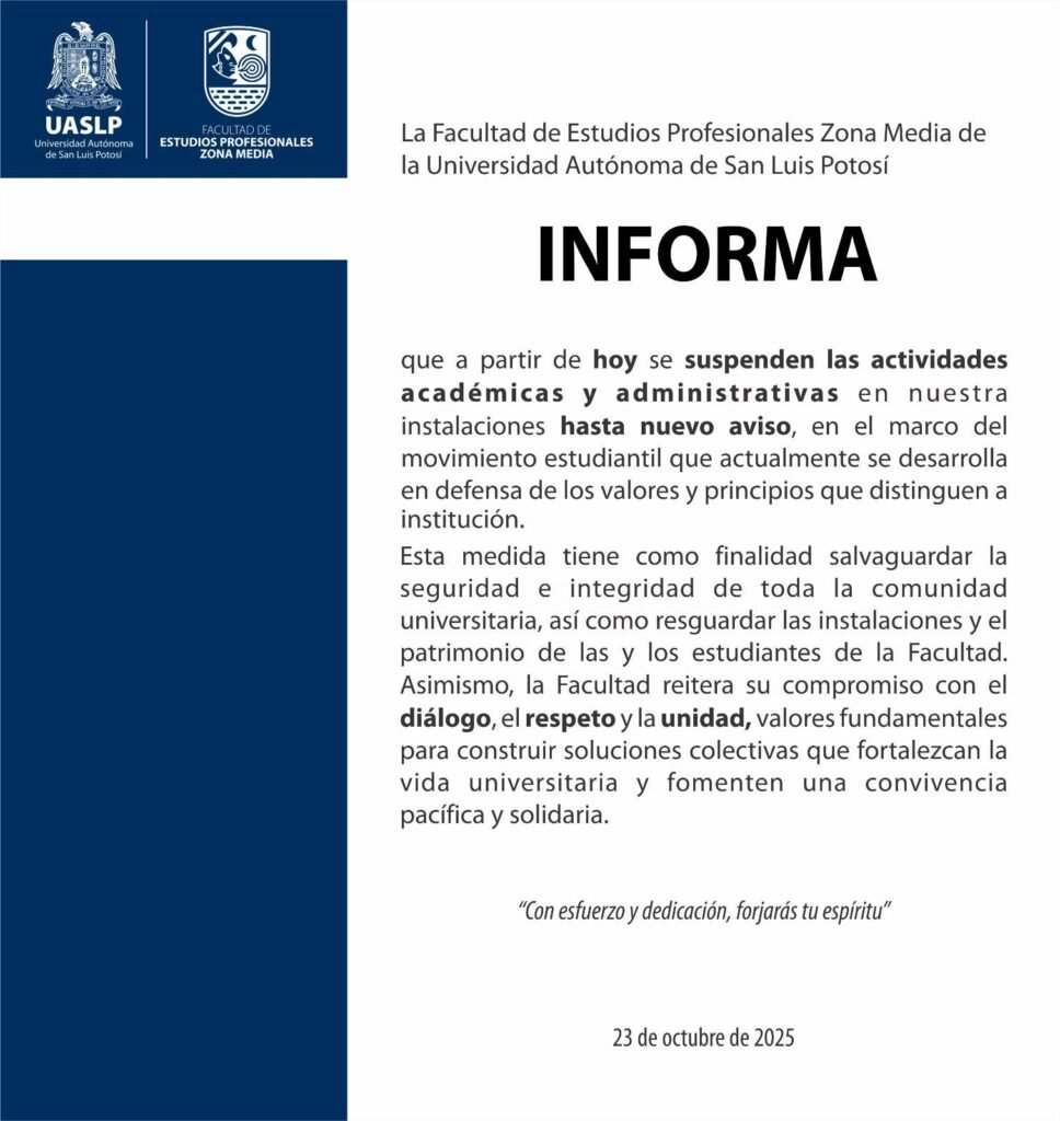 Por lo que La Facultad de Estudios Profesionales Zona Media de la Universidad Autónoma de San Luis Potosí informó que a partir de hoy se suspenden las actividades académicas y administrativas en nuestras instalaciones hasta nuevo aviso, en el marco del movimiento estudiantil que actualmente se desarrolla en defensa de los valores y principios que distinguen a la institución.