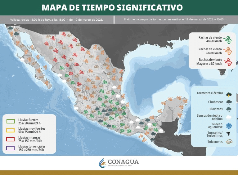 En los párrafos posteriores te damos un pronóstico específico de cómo se estarán comportando los parámetros meteorológicos como la lluvia y el viento a lo largo de la República Mexicana.