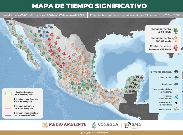 Vientos con rachas de 40 a 60 km/h: Golfo de California; con tolvaneras: Baja California Sur, Sonora, Sinaloa, Chihuahua, Coahuila, Nuevo León, San Luis Potosí, Zacatecas, Durango, Aguascalientes, Jalisco, Colima, Guanajuato, Querétaro, Hidalgo, Tlaxcala, Puebla, Estado de México y Ciudad de México.