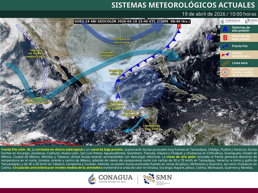 Este día, el frente frío núm. 45 se desplazará sobre el noreste del territorio mexicano y el litoral del golfo de México, interaccionará con un canal de baja presión extendido sobre el sureste del país, propiciando chubascos y lluvias fuertes en el noreste, centro y oriente del territorio nacional, además de lluvias puntuales muy fuertes en Tamaulipas (noreste), Nuevo León (centro y sur), Hidalgo (norte), Oaxaca (norte), Puebla (norte) y Veracruz (norte y centro).