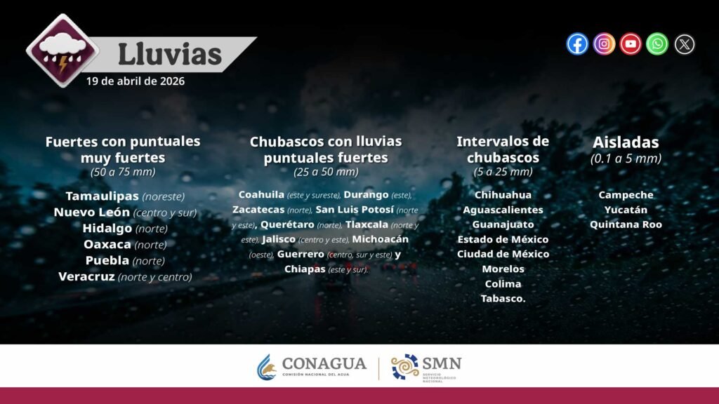 Pronóstico de lluvias para hoy 19 de abril de 2026: