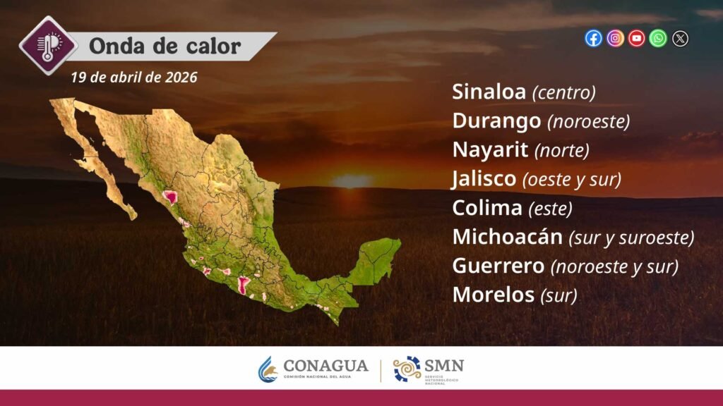 Todas las lluvias estarán acompañadas con descargas eléctricas y posible caída de granizo. Finalmente, una circulación anticiclónica en niveles medios de la atmósfera mantendrá la onda de calor en Sinaloa (centro), Durango (noroeste), Nayarit (norte), Jalisco (oeste y sur), Colima (este), Michoacán (sur y suroeste), Guerrero (noroeste y sur) y Morelos (sur).
