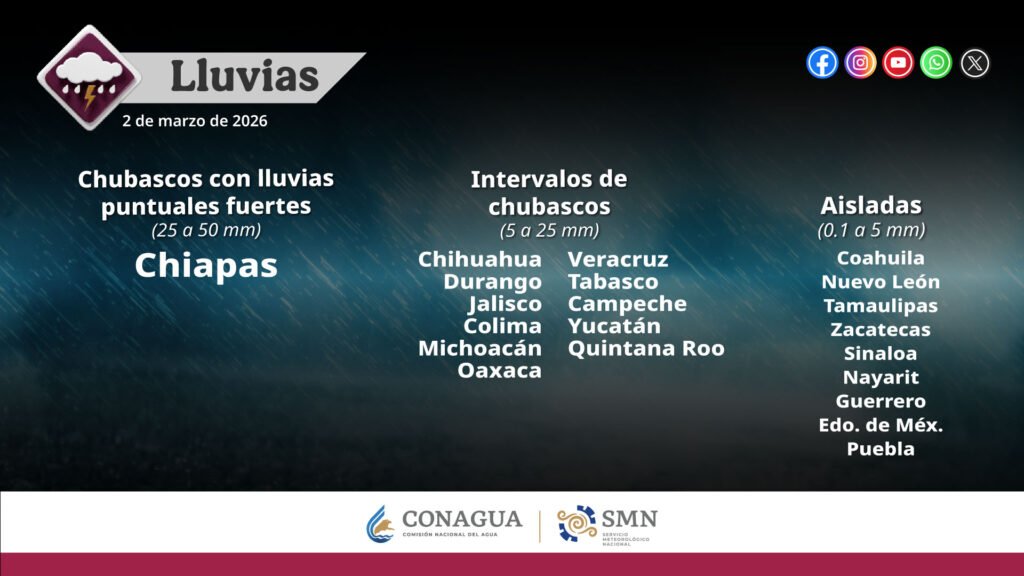 Lluvias aisladas (0.1 a 5 mm): Chihuahua, Sinaloa, Coahuila, Nuevo León, Zacatecas, Aguascalientes, Nayarit, Guerrero, Tlaxcala, Ciudad de México, Morelos y Puebla.