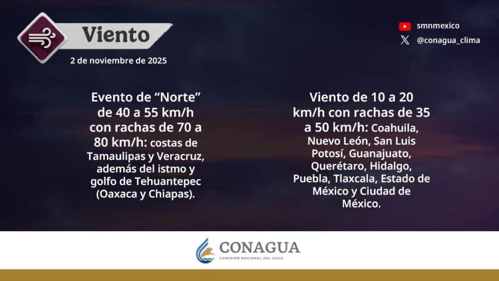 Viento de 10 a 20 km/h con rachas de 35 a 50 km/h: Baja California Sur, Chihuahua, Coahuila, Nuevo León, Durango, Zacatecas, Aguascalientes, San Luis Potosí, Nayarit, Jalisco, Michoacán, Guanajuato, Querétaro, Hidalgo, Puebla, Tlaxcala, Estado de México, Ciudad de México y Guerrero.