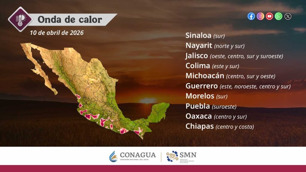 Para hoy, una vaguada en altura y la corriente en chorro subtropical, propiciarán rachas fuertes de viento, descenso de temperatura y lluvias en el noroeste del territorio nacional. Una línea seca se establecerá en el noreste de México, lo que generará lluvias puntuales fuertes con la posible formación de torbellinos en la zona fronteriza de Chihuahua, Coahuila, Nuevo León y Tamaulipas. Canales de baja presión en el interior del país, en combinación con inestabilidad en altura y con el ingreso de aire húmedo del océano Pacífico, golfo de México y mar Caribe, generarán chubascos y lluvias puntuales fuertes con descargas eléctricas y posible caída de granizo en el oriente, centro, sur y sureste del país, incluido el Valle de México y la península de Yucatán. Finalmente, prevalecerá la onda de calor en zonas de Sinaloa (sur), Nayarit (norte y sur), Jalisco (oeste, centro, sur y suroeste), Colima (este y sur), Michoacán (centro, sur y oeste), Guerrero (este, noroeste, centro y sur), Morelos (sur), Puebla (suroeste), Oaxaca (centro y sur) y Chiapas (centro y costa).