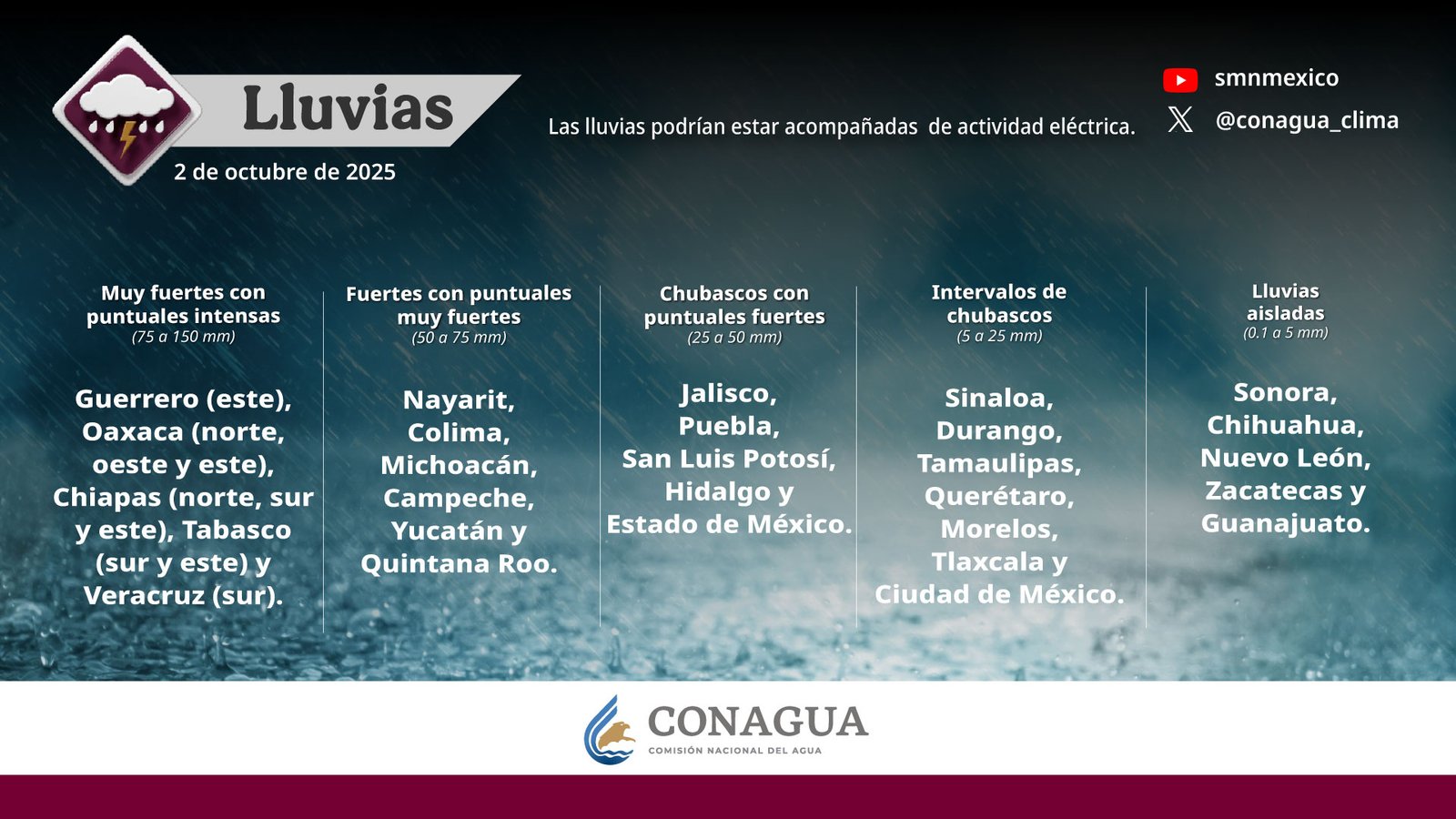 Pronóstico de lluvias para hoy 02 de octubre de 2025: