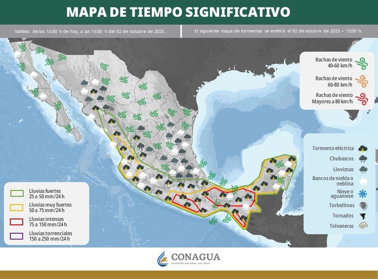 Para hoy, una zona de baja presión con probabilidad para desarrollo ciclónico al sur de Guerrero y la vaguada monzónica que se extenderá frente a las costas del Pacífico Sur Mexicano, ocasionarán lluvias puntuales intensas en Guerrero; muy fuertes en Michoacán, Colima y Nayarit; fuertes en Jalisco, e intervalos de chubascos en Sinaloa. Por otra parte, el aporte de aire húmedo del mar Caribe y golfo de México, generado por un canal de baja presión en el sureste mexicano y una baja presión sobre el suroeste del golfo de México, mantendrán las condiciones para lluvias puntuales intensas en Oaxaca, Chiapas, Tabasco y Veracruz; y puntuales muy fuertes en Quintana Roo, Yucatán y Campeche. Por su parte, canales de baja presión sobre el interior del país, inestabilidad atmosférica y el ingreso de aire húmedo del océano Pacífico y golfo de México, originarán lluvias puntuales fuertes en Puebla, Estado de México, Hidalgo y San Luis Potosí; intervalos de chubascos en Morelos, Tlaxcala, Ciudad de México, Querétaro, Tamaulipas y Durango; así como lluvias aisladas en zonas de Guanajuato, Zacatecas, Nuevo León, Chihuahua y Sonora. Finalmente, continuará el ambiente cálido a caluroso por la tarde en la mayor parte del territorio nacional, y muy caluroso con temperaturas máximas de 40 a 45 °C en zonas de Sinaloa.