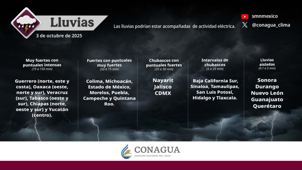Pronóstico de lluvias para hoy 03 de octubre de 2025: