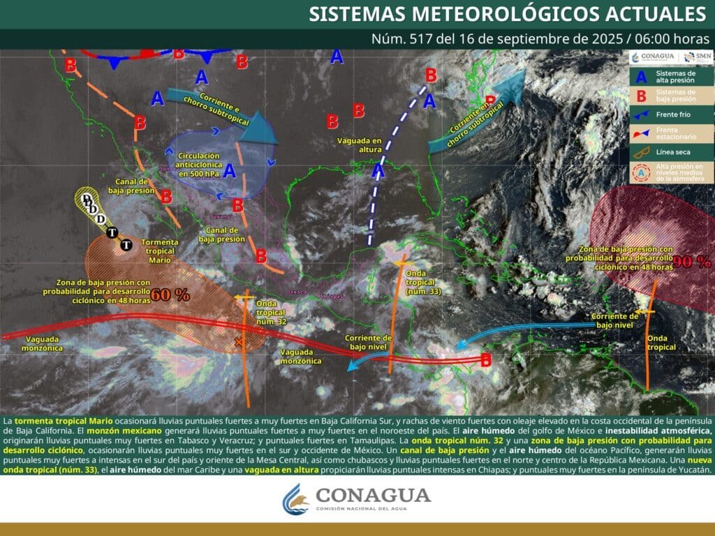 Para hoy, la tormenta tropical Mario se ubicará frente a la costa occidental de la península de Baja California y su circulación ocasionará lluvias puntuales muy fuertes en Baja California Sur, así como lluvias puntuales fuertes en Baja California, además de rachas de viento fuertes y oleaje elevado en la costa occidental de la península de Baja California. El monzón mexicano generará lluvias puntuales muy fuertes en Nayarit, Sinaloa, Durango y Chihuahua; y puntuales fuertes en Sonora. Por su parte, el ingreso de aire húmedo del golfo de México e inestabilidad atmosférica, originarán lluvias puntuales intensas en Tabasco y Veracruz; y puntuales fuertes en Tamaulipas. La onda tropical núm. 32 que se desplazará sobre el occidente de la República Mexicana, asociada con una zona de baja presión con probabilidad para desarrollo ciclónico, ocasionarán lluvias puntuales muy fuertes en Michoacán, Colima y Jalisco. Un canal de baja presión que se extenderá sobre el norte, centro y sur del territorio nacional y el ingreso de aire húmedo del océano Pacífico, ocasionarán lluvias puntuales intensas en Oaxaca; puntuales muy fuertes en Puebla y Guerrero; puntuales fuertes en Morelos, Ciudad de México, Estado de México y San Luis Potosí; así como chubascos en Tlaxcala, Hidalgo, Querétaro, Guanajuato, Aguascalientes, Zacatecas, Nuevo León y Coahuila. Una nueva onda tropical (núm. 33) se desplazará sobre la península de Yucatán y en combinación con la entrada de aire húmedo del mar Caribe y con una vaguada en altura situada al norte de dicha península, propiciarán lluvias puntuales intensas en Chiapas; y puntuales muy fuertes en Quintana Roo, Yucatán y Campeche. Finalmente, continuará el ambiente cálido a caluroso por la tarde en la mayor parte del territorio nacional, así como ambiente muy caluroso con temperaturas máximas mayores a 40 °C en zonas de Veracruz, Tabasco, Oaxaca y Chiapas.
