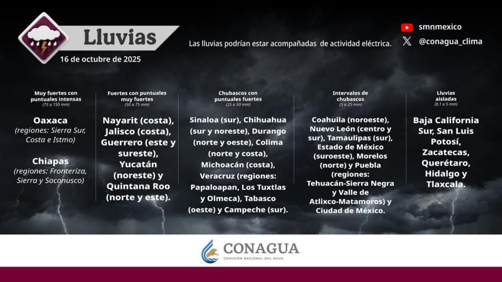 Pronóstico de lluvias para hoy 16 de octubre de 2025: