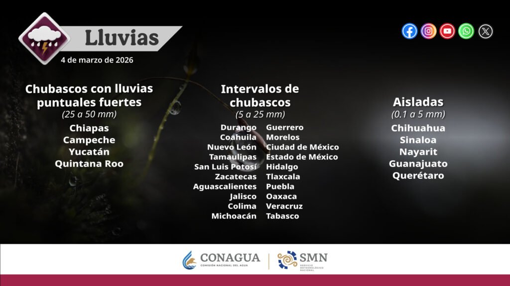 Chubascos con lluvias puntuales fuertes (25 a 50 mm): Coahuila, Nuevo León, Tamaulipas, San Luis Potosí, Hidalgo Guanajuato, Querétaro, Estado de México, Tlaxcala, Puebla, Oaxaca, Campeche, Yucatán y Quintana Roo.