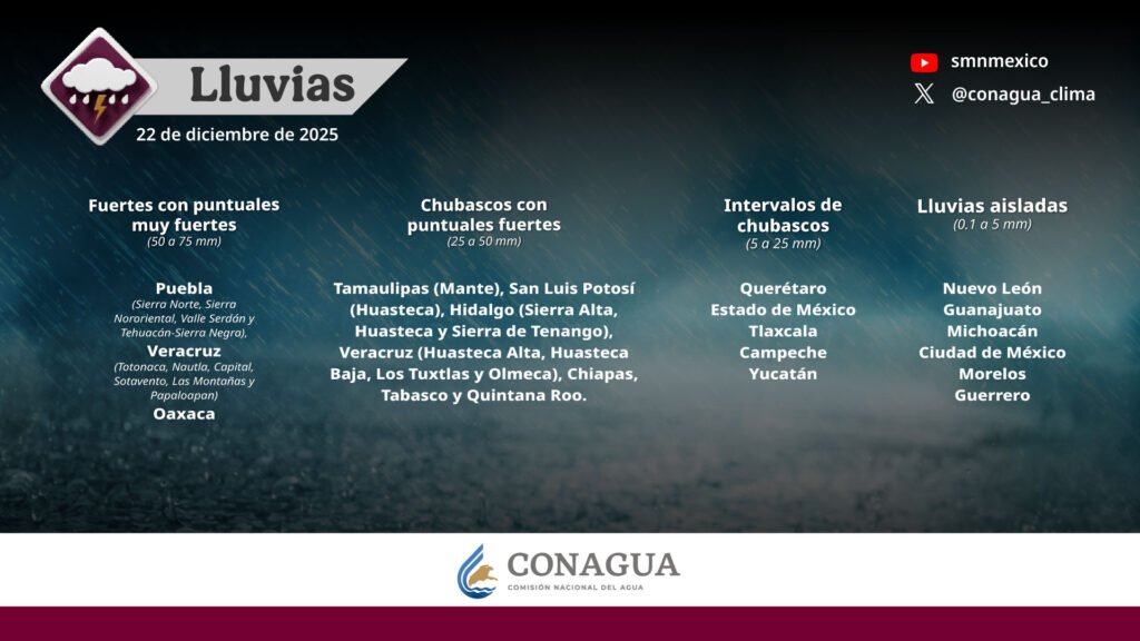 Pronóstico de lluvias para hoy 22 de diciembre de 2025: