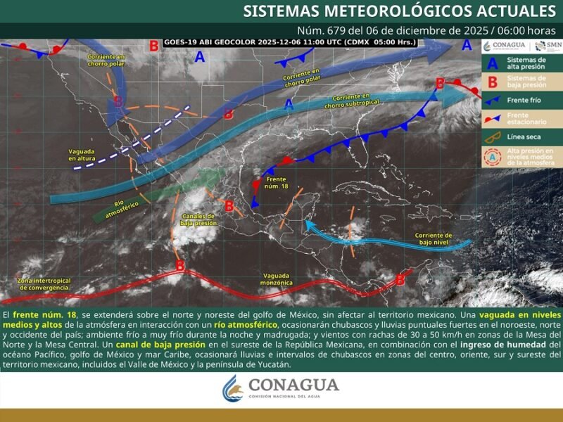 Este día, el frente núm. 18 con características de estacionario, se extenderá sobre el norte y noreste del golfo de México, sin efectos sobre el territorio mexicano. Asimismo, una vaguada en niveles medios y altos de la atmósfera continuará sobre el norte y noroeste de México y, en interacción con el río atmosférico desde el occidente hasta el noreste del país, ocasionarán chubascos y lluvias puntuales fuertes en el noroeste, norte y occidente del país; así mismo, se mantendrá el ambiente frío a muy frío durante la noche y madrugada; y vientos con rachas de 30 a 50 km/h en zonas de la Mesa del Norte y la Mesa Central. Finalmente, un canal de baja presión en el sureste de la República Mexicana, en combinación con el ingreso de humedad del océano Pacífico, golfo de México y mar Caribe, ocasionará lluvias e intervalos de chubascos en zonas del centro, oriente, sur y sureste del territorio mexicano, incluidos el Valle de México y la península de Yucatán.