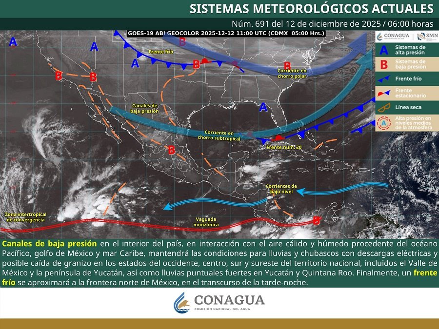 Este día, canales de baja presión en el interior del país, en interacción con el aire cálido y húmedo procedente del océano Pacífico, golfo de México y mar Caribe, mantendrá las condiciones para lluvias y chubascos con descargas eléctricas y posible caída de granizo en los estados del occidente, centro, sur y sureste del territorio nacional, incluidos el Valle de México y la península de Yucatán, así como lluvias puntuales fuertes en Yucatán y Quintana Roo. Finalmente, un frente frío se aproximará a la frontera norte de México, en el transcurso de la tarde-noche.